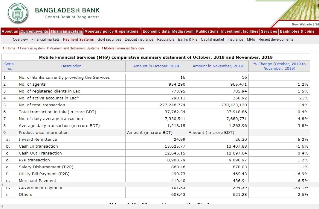 বাংলাদেশ ব্যাংকের অক্টোবর ২০১৯ থেকে নভেম্বর ২০১৯ পর্যন্ত Mobile Financial Services (MFS) এর একটি তুলনামূলক স্টেটমেন্টে প্রমান করে ইলেক্ট্রনিক লেনদেনের গুরুত্ব।